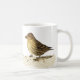 Cette tasse comporte un pin Siskin du côté droit qui semble parler à un chardonneret masculin de l'aile gauche, bien qu'il ait une graine de tournesol dans sa bouche ! Ils se tiennent dans la neige un jour ensoleillé d'hiver illuminé par une lumière d'or.
