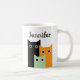 Bouge à café adorable avec trois chats amusants. L'une est noire, à gauche du design, l'autre est orange, légèrement en bas et à droite du chat noir, légèrement devant et l'autre est turquoise, en bas des deux autres chats et debout devant eux. Le seul trait sur les chats est les grands yeux ronds. Au-dessus des chats est un modèle à ajouter votre nom pour personnaliser.