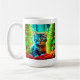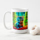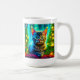 Chatons gris mignons à deux côtés assis devant une tasse de café aux arbres de Noël éclairée.