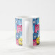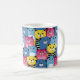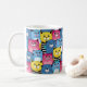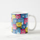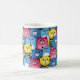 Une tasse colorée avec un motif ludique de chats de dessins animés dans différentes couleurs et expressions.