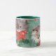 Belle image vintage des visages noirs, gris et blancs de chat jouant ou portant un arc rouge de ruban. Mélangé sur un arrière - plan vert, à un certain feuille de gui, cette conception est parfaite pour des amoureux de les chats.