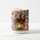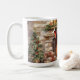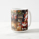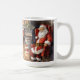 Mignonne tasse pour Noël avec le Père Noël assis à côté d'une cheminée chaude et rugissante accrochée à des bas rouges et décorée de verdure des Fêtes. Il y a un joli sapin de Noël et des cadeaux enveloppés d'or avec du ruban rouge. Personnalisez avec nom, monogramme ou initiales.