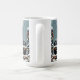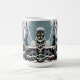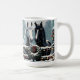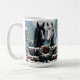 Jolie tasse de café de Noël avec les graphiques d'un cheval blanc et d'un cheval noir debout à une porte en bois décorée de rires de vacances et de jolies lumières scintillantes de Noël recouvertes de neige. Ces chevaux sont faits dans un dessin humoristique de style pop art pour évoquer un sentiment nostalgique.