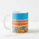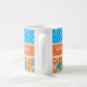 Un café Mug blanc très design à personnaliser si vous le souhaitez, avec un mix'n'match motif motif de fleurs rouges, orange, jaunes sur un arrière - plan turquoise brillant, d'un collage de papier peint à la main par Judy Adamson, s'est associé à un motif de polka blanc et turquoise coordonné.