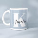 Tasse bleu clair personnalisée avec votre monogramme initial dans la grande typographie blanche moderne et votre nom dans un script signature élégant.