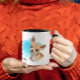 Un beau portrait d'un petit Chihuahua Chig marron est la caractéristique de deux côtés de cette tasse. Chaque image est placée sur un arrière - plan à bec bleu vif. Entre les deux images se trouve le texte qui décrit ce fidèle compagnon avec l'attitude du "grand chien". Le texte en noir sur le bas indique "le chien CHIHUAHUA". Tout le texte est facilement customisé à tout ce que vous préférez ; décrivez votre fidèle petit ami !