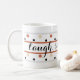 Rire, Sourire, Citation en direct est écrit en élégant script noir au centre des doubles lignes rayées Terra Cotta. Couleurs géométriques de la nature motif avec Terra Cotta, sable, pois noirs et rayures gris clair. Conception moderne et tendance de la cuisine. Conception originale © TamiraZDesigns.