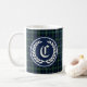 Tasse à café avec le tartan de clan pour la famille Campbell et ses septs. motif en plaid écossais vintage en bleu marine, vert foncé et noir, avec des tons blancs et jaune vif. Dispose d'un badge rond bleu marine avec des lauriers des deux côtés de la tasse avec une initiale monogramme dans une police Old English.