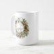 This beautifully designed holiday coffee mug features elegant watercolor artwork of a wreath adorned with a white bow, pinecones, holly leaves, red berries, and pine needles. Its classy yet rustic design, along with the customizable "Happy Holidays" text, captures the essence of the December holiday season, making it a thoughtful choice for spreading holiday cheer.