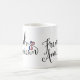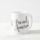 French American Entwins Hearts Mug. Que vous soyez d'origine française, française ou française, ou que vous et votre moitié soyez français et américains ! Il s'agit d'une police de caractères scénarisée, avec deux coeurs enchevêtrés avec des drapeaux américains et français, et le texte : French American.