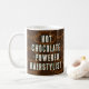 Pour un coiffeur qui aime le chocolat chaud, voici une tasse humoristique à assortir. La tasse est brun chocolat foncé avec un motif arrière - plan des mots "chocolat chaud" en orange brûlé. Le slogan d'un côté est "Hot chocolate-powered hair stylist", de l'autre, la tasse peut être personnalisée avec un nom. Un cadeau idéal pour le coiffeur amateur de chocolat.
