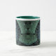 Tasse de café avec "Cosmic Pod", art abstrait, copyright © 2008, Susan Wallace. motif circulaire labyrinthique dans les tons verts et bleus, mêlant des formes géométriques dans un design futuriste complexe.
