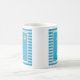 Une tasse à café personnalisée sur le thème nautique. Conçu avec un motif rayé bleu et un cadre bleu avec une bordure jaune superposée. Un phare rayé rouge et une boule de plage, un soleil souriant et une mouette volante au loin positionné à l'intérieur du cadre. Personnalisez avec un nom.