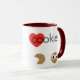Aimez les cookies tasse Met in rood hart. Afgebeeld staan 2 koekjes. 1 met 2 grote ogen de andere die al voor een deel is opgegeten.