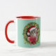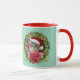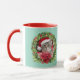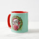 Une jolie tasse de café drôle de Noël avec un chat tabby gris portant un chapeau de Père Noël sortant d'une couronne de Noël.