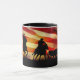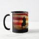Une tasse à café occidentale de cow-boys conduisant du bétail et un grand drapeau américain en arrière-plan.