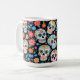 Des crânes de sucre peints tombent à travers des fleurs colorées sur cette tasse de café pour Dia de Los Muertos.