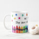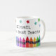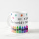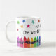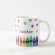 Tasse de café pour l'enseignant du monde personnalisée avec le nom de l'enseignant sous des étoiles colorées et au-dessus d'une rangée de crayons dans un dégradé de couleurs de l'arc-en-ciel. Tasse de café pour enseignant de maternelle avec des crayons et des étoiles colorés.