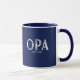 Conception d'une tasse à café opa avec une année bien établie avec une police blanche estampillée sur un arrière - plan bleu Navy. Cliquez sur personnaliser pour modifier la couleur arrière - plan!. Visitez notre boutique pour voir cette tasse dans un large assortiment de noms de grand-père.