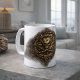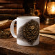 Designed as a wrap-around print, the coin is positioned to read naturally from the handle-out view, with a softened ash halo that carries the mark across the mug without overpowering the white ceramic base. The result feels intentional and lived-in, not novelty.