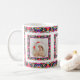 Custom Jolly Noël Motif Photo Photo Tea Coffee Mug. Dans les couleurs traditionnelles de rouge, bleu et vert, avec des touches de rose chaud et d'orange vif ; dans un joli motif multicolore. Pour des boissons chaudes en hiver et un chocolat chaud gai lors de nuits douillettes en hiver. Changez les trois photos en vos propres photos pour célébrer les souvenirs de famille. Achetez comme un cadeau de table de gardien de fête à petit prix pour elle ou ses grands-parents.