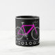 Cycologiste en texte blanc sur noir avec vélo rose sur ligne grise.