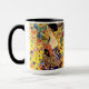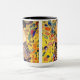 Mug de café avec peinture à l’huile de Gustav Klimt Lady with Fan (1918). Une femme portant un kimono bleu tient un ventilateur rouge contre un arrière - plan jaune coloré de fleurs et de paons. Un grand cadeau pour les amateurs de Japonisme et d'art européen.