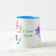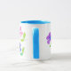 Une tasse à café blanc chic avec lèvre et poignée bleue, décorée avec un motif floral, d'un collage en papier peint à la main par Judy Adamson.