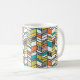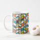 Cette tasse a un design moderne du milieu du siècle de l'épine de hareng avec des couleurs et des lignes rétro remplissant certains des espaces.