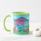 Cette Mug Retro Dream House ajoutera une touche de fantaisie à votre journée. Le dessin est composé d'un dessin d'une maison de poupée classique pour enfants. La maison de poupées de deux étages montre l'idée de glamour de chaque petite fille. Murs et sol rose et turquoise dans la cuisine, réfrigérateur rose clair, table et chaises orange, horloge bleu, starburst. L'homme de la maison est assis à la table en profitant d'un peu de temps d'arrêt. Son costume noir et ses cheveux jaunes sont visibles derrière le journal du matin. Sur la table, on trouve un succulent gâteau à trois couches avec glaçage rose et chocolat. Dans le salon adjacent, une superbe femme blonde platine est posée sur un canapé rose chaud. Elle a l'air d'une poupée vivante dans sa robe jaune impétueuse, parfaite pour profiter du feu dans la cheminée à cônes roses. Sur le sol turquoise, un tapis imprimé zèbre. Un ottoman orange est également présent dans la chambre. Les murs sont en mousse de mer verte et en brique rose. Un luminaire Spoutnik jaune pendent du plafond. Derrière le canapé, se trouve l'oeuvre encadrée d'une chaussure en stiletto rose. A l'étage, on peut voir la suite master. La chambre poursuit la décoration turquoise et rose qui est si répandue dans la maison. Un lit vert mousse de mer avec une literie violette. A côté du lit, une paire de chaussures roses en stiletto sont visibles. Sur le mur, il y a quatre gravures pop art de la dame de la maison. Dans le coin de la chambre, une grande lampe de sol, jaune et bleu, moderne du milieu du siècle. La salle de bain est carrelée de bleu turquoise et rose et dispose de toilettes rose clair et d'une baignoire de pied de griffe. Le mur vert mousse de mer est compensé par la bordure en papier peint floral turquoise et rose. Les résidents n'ont pas besoin de s'inquiéter de faire des améliorations et de l'entretien dans cette maison. Les bardeaux violets sur le toit sont étanches à l'eau ! La maison est assise sur une pelouse verte parfaitement entretenue avec des fleurs roses et jaunes. Il y a une clôture blanche derrière la maison de rêve. Une ligne d'horizon d'aqua n'est marquée que par les silhouettes de nuages fluides et bleu clair et de cèdres. A côté de la maison, il y a un panneau rouge à vendre sur un poteau blanc. Et, bien sûr, la caractéristique la plus notable est le mot "SOLD" sur le panneau !