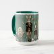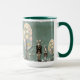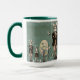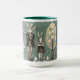 Mug de Pâques : Domination Mondiale - Un Oeuf à la fois (humour ! En vert sauge avec un lapin Dapper et une fille portant des oreilles de lapin et les bras pliés. Un arbre à fleurs de printemps en collage avec un lapin et un oeuf en dessous. Lettre en bleu néon et pêche.