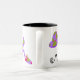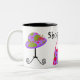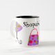 Tasse Whimsical, avec des graphiques amusants d'un casquette rose, lavande et vert, sac à main, et talons hauts. Le texte noir en haut indique Shopaholic. Super tasse pour chaque utilisation quotidienne à la maison ou au bureau.