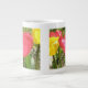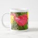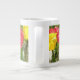 Cette énorme tasse présente une photo de tulipes à franges rouges et jaunes. La photo a été prise en utilisant la macro photographie, ce qui donne des détails si brillants que vous pouvez voir les petites franges et les changements subtils de la lumière agissant sur la tulipe rouge centrale.