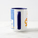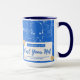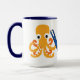 Une grande tasse avec le graphique bleu Cast Your Net à l'avant, et la jolie petite pieuvre avec un stylo à l'arrière. Poignée bleue.