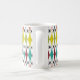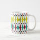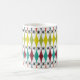 Cette tasse présente un design moderne du milieu du siècle de diamants étirés et de starbursts sur un champ de blanc.