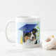 Félicitez votre diplômé préféré avec un cadeau avec un joli et heureux diplômé australien de Shepherd portant un mortier au milieu d'une flûte de confettis.