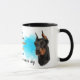 Un beau portrait d'un Doberman Pinscher Dog noir et bronzé est la caractéristique sur les deux côtés de cette tasse. Chaque image est placée sur un arrière - plan à bec bleu vif. Entre les deux images se trouve le texte qui décrit ce compagnon loyal et courageux, avec "le chien DOBERMAN PINSCHER" en noir en bas. Tout le texte est facilement customisé à tout ce que vous préférez ; décrivez votre fidèle ami !