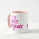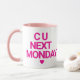 Bold Pink Text on White & Pink Coffee Cup.Commencez vos matins avec un sourire en utilisant cette tasse "C U Next Monday", conçue avec un bloc rose audacieux lettrage sur une tasse blanche propre avec poignée et intérieur rose assortis. Ce design sobre et pointu conviendra parfaitement à ceux qui apprécient l'humour avec un peu d'attitude. Grande comme un cadeau de gag, une tasse de café de bureau ou un pick-me personnel, cette tasse ajoute une déclaration audacieuse à tout rituel de caféine. Ce n’est pas pour les faibles de coeur, c’est pour les audacieux et sans excuses.