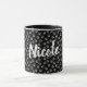 Tasse Empreinte de patte avec nom. Motif empreinte de patte gris sur arrière - plan noir et nom personnalisé blanc. Personnalisez en remplaçant le nom de l'exemple Nicole par votre propre nom ou nom personnalisé ou le texte de votre choix. Une idée cadeau personnalisée pour une maman de chat, un propriétaire de chien ou tout autre amoureux des animaux de compagnie.