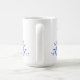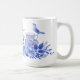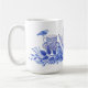 Cette tasse présente un design monochromatique avec un set de thé bleu et blanc entouré d'oiseaux et de fleurs.