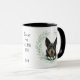 "LOVE MY KELPIE DOG" declares this mug for the proud Australian Kelpie owner. Each side of the mug has a beautiful portrait of a black and tan Kelpie framed by soft green watercolor eucalyptus leaves. Between the two images is the text, which may be easily customized, or even removed, by you, and your monogram or name.