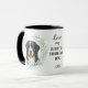 "LOVE MY BERNESE MOUNTAIN DOG" declares this mug for the proud Berner dog owner. Each side of the mug has a beautiful portrait of a Bernese Mountain Dog framed by soft green watercolor eucalyptus leaves. Between the two images is the text, which may be easily customized, or even removed by you, and your monogram or name.