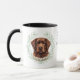 "LOVE MY CHOCOLATE LAB" declares this mug for the Labrador Retriever dog owner. Each side of the mug has a watercolor portrait of a beautiful chocolate brown Lab framed by soft green watercolor eucalyptus leaves. Between the two images is the text, which may be easily customized, or even removed by you, and your monogram or name.
