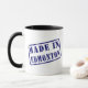 Fait à Edmonton ! Êtes-vous d'Edmonton, Canada ? Avez-vous un ami ou un membre de la famille qui aiment Edmonton, Canada ? Si oui, ceci "a fait dans…" la tasse est exactement le cadeau que vous recherchez ! Les caractéristiques de conception un patiné "fait à Edmonton" dans la marine pochoir-comme le lettrage entouré par une marine ont arrondi le rectangle.