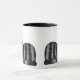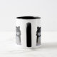 Chat, rayé noir et blanc. La peinture du chat est posée avec la queue recouverte et l'alerte thermique. Les cheveux longs apparaissent dans la queue et le visage moelleux. Une image de chaque côté, face à la poignée de la tasse.