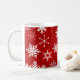Des flocons de neige blancs et rouges sur un arrière - plan rouge sur une tasse à café pour se personnaliser avec un nom. Le nom sera un peu éloigné du centre quand je l'ai caché là où il convient. Une bonne idée pour un paysage de table de vacances serait d'avoir des tasses personnalisées comme des assignations de places assises, puis ils peuvent servir de cadeaux pour les invités.
