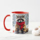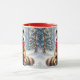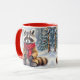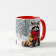 Super mignonne tasse de café de Noël qui a un aquarelle d'air, illustration d'un raton laveur festif assis dans une forêt capricieuse de neige pendant une journée d'hiver avec en toile de fond des pins décorés de vacances.