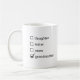 Cette tasse dit tout ! C'est une fille. C'est une soeur. C'est une mère. Mais surtout, c'est une grand-mère ! Et, vous pouvez personnaliser cette tasse pour avoir le nom que vous appelez elle - Nana, Nonnie, Gigi, Mimi, Meemaw, Grand-mère, Abuela, Oma, Bubbe. Prenez cette tasse pour votre mère, votre soeur, votre grand-mère, votre femme, votre fille - toute femme que vous connaissez qui est une grand-mère merveilleuse ! C'est aussi une jolie façon de lui faire savoir qu'un bébé est en route !