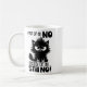 A funny, sarcastic black-and-white graphic design showcases a black cat with frazzled fur and a scowling expression. The black handwritten text says, "First of all, no. Second of all, still no!" Available on a wide variety of products, this design makes a perfect gift for cat lovers.