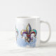 Choix de styles de tasse incluant le verre. Couleur intérieure personnalisable pour d'autres styles. Fleur de Lis avec pierre décorative au centre sur un nuage bleu transparent.
